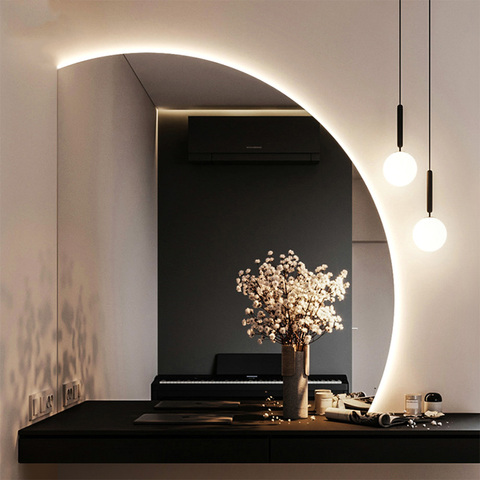 مرآة مرحاض ذكية بإضاءة ليد على شكل خاص ، مرآة زينة مضيئة تُثبت على الحائط ، مرآة نصف دائرية
