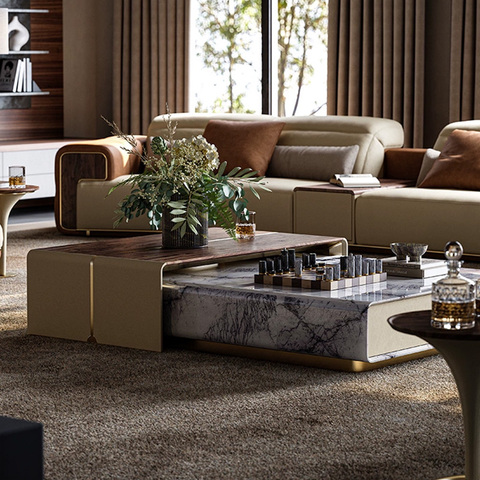 Table basse moderne en marbre avec cadre en bois, grande table d'appoint rétractable à double niveau pour salon de villa, combinaison