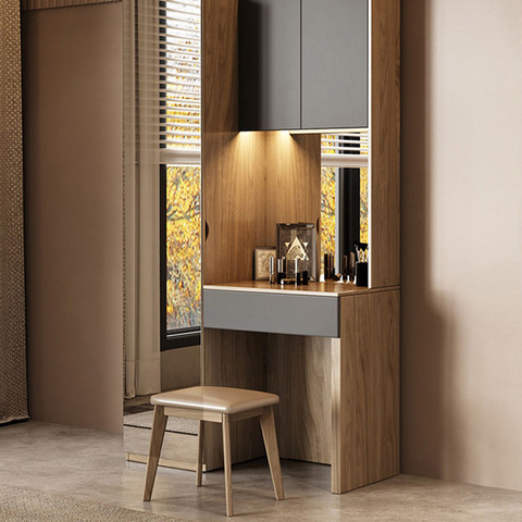 Nordico moderno semplice toletta in legno con specchio a figura intera e specchio per il trucco illuminato per lo stoccaggio della camera da letto e l'uso del guardaroba