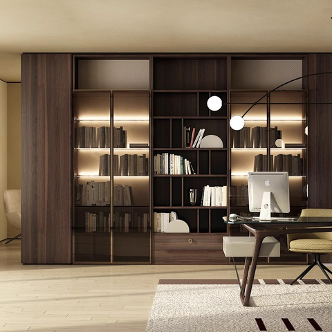 Tủ Sách phòng khách Gỗ Óc Chó màu đen tích hợp toàn bộ ghế sofa thẻ tường phía sau giá sách Thư viện có cửa