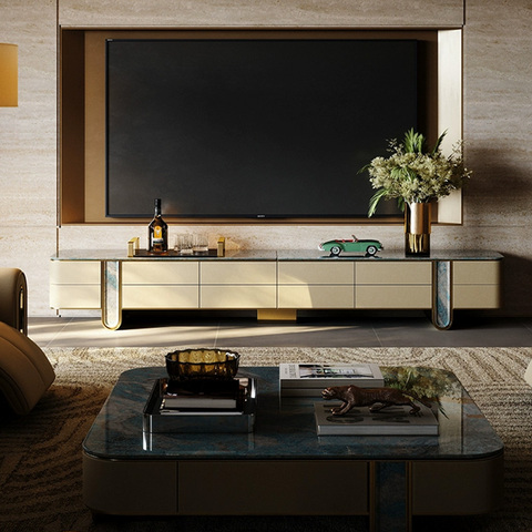 가벼운 럭셔리 슬레이트 텔레스코픽 TV 벽 캐비닛 커피 테이블 조합 현대 스테인레스 스틸 황금 바닥 캐비닛 사물함